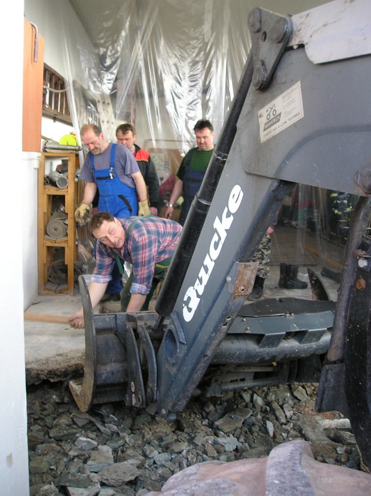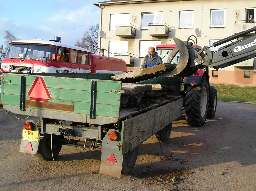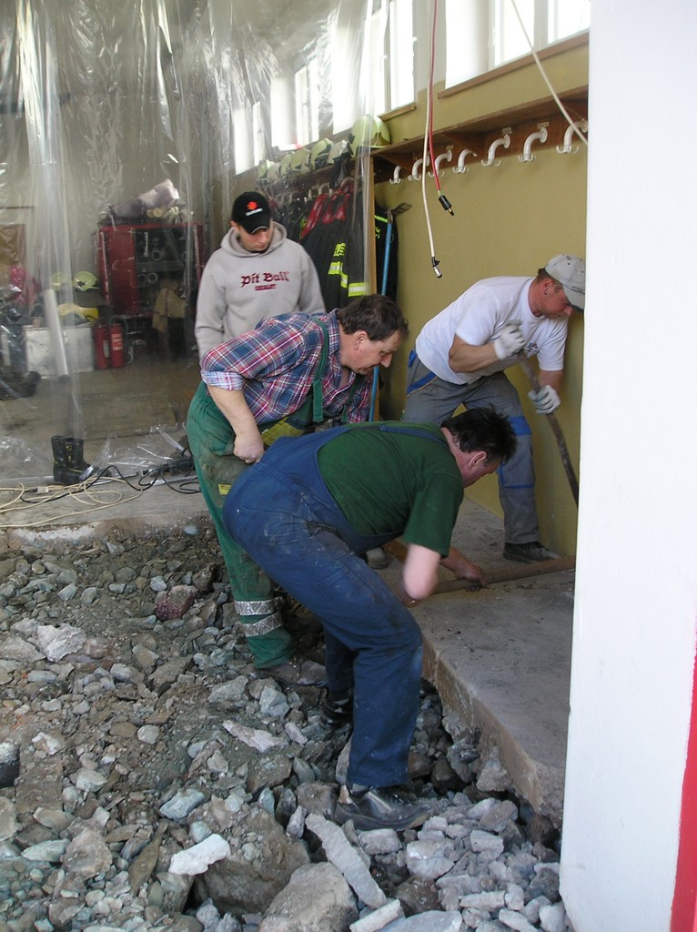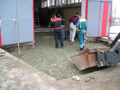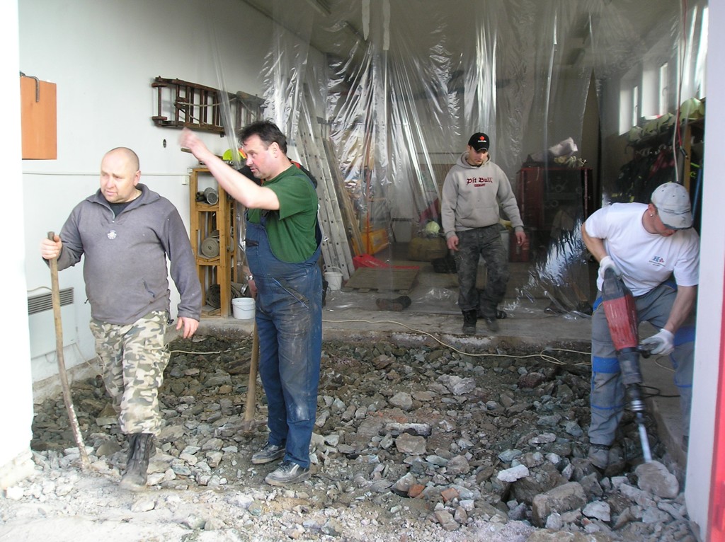 | Když jsme se dozvěděli, že na výrobní lince továrny THT již stojí vozidlo určené pro náš sbor, nebylo dále na co čekat a začali jsme s úpravou vrat garáže hasičské zbrojnice. Kvůli výšce nové cisterny bylo nutné snížit podlahu ve vratech přibližně o 30 cm.