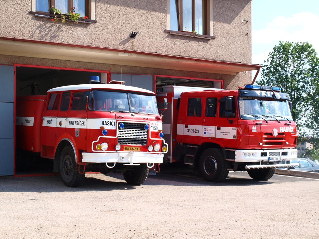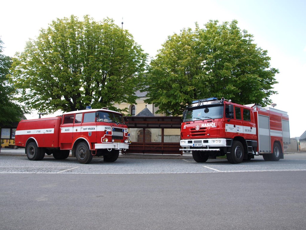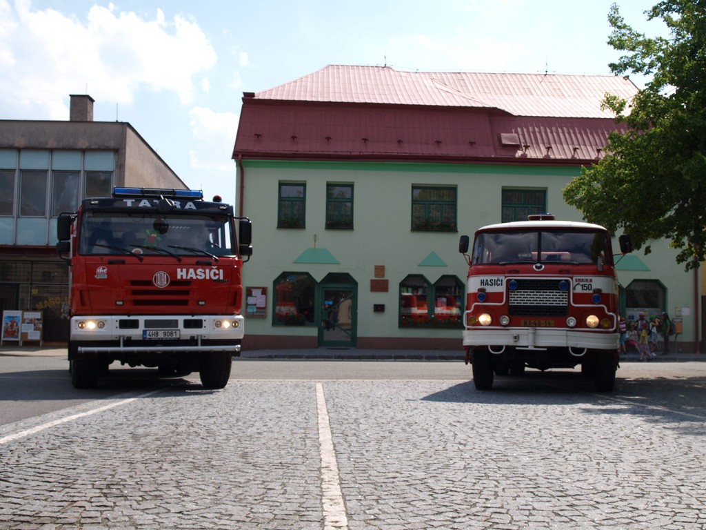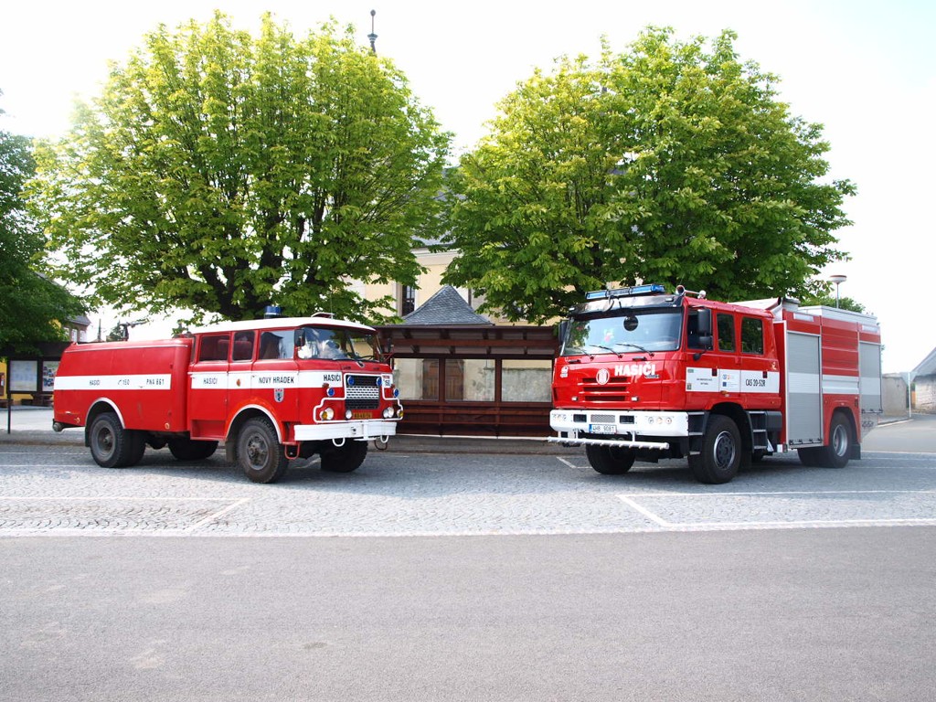 | V rámci pravidelné údržby techniky bylo v pondělí 30. května pořízeno na náměstí a u hasičárny několik společných fotografií staré cisterny Škoda 706 a nové Tatry T815. | |