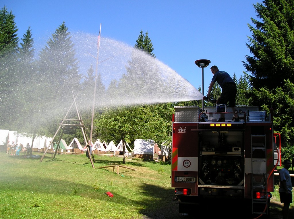 | Po několikaleté odmlce jsme znovu rádi přijali pozvání na letní tábor mladých hasičů na Kamenci. Kromě prohlídky cisterny a technického vybavení si děti nejvíce užívaly proud vody z vysokotlaku a děla. Vyhlídku po okolí zajistil automobilový žebřík z Nového Města. | |