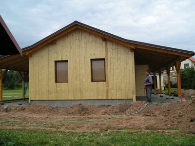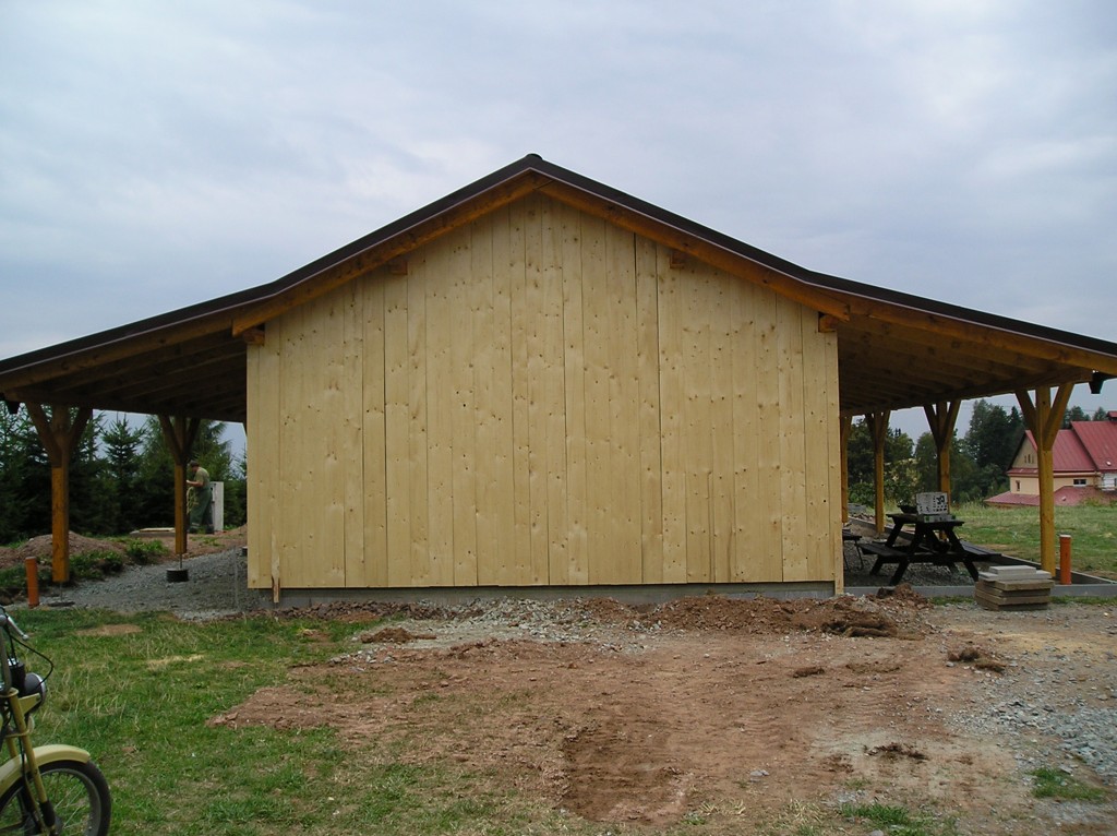 | Termín soutěže se blížil a sklad začínal mít finální podobu. Věnovali jsme se proto térenním úpravám v jeho okolí. Usadili jsme obrubníky a začali pokládát zámkovou dlažbu. | |