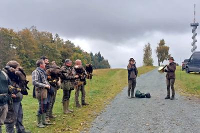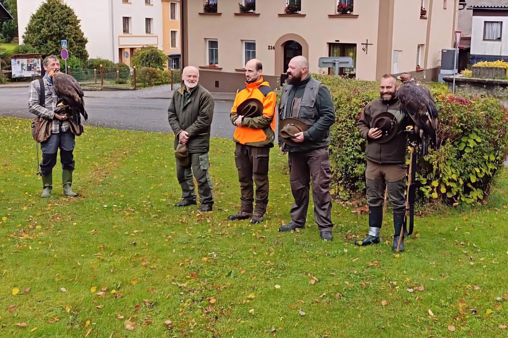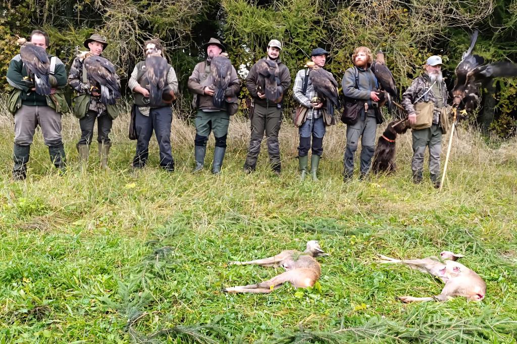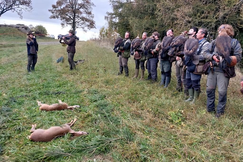 Pro tyto účely jsme na pátek 10.10.2025 připravili několik lečí v okolí Nového Hrádku. Počasí se na nás letos mračilo a ranní mlha neslibovala velké výhledy na panoráma Orlických hor, ale vše se v dobré obrátilo. Akce se zúčastnilo osm lovců s orly z České republiky, Chorvatska, Holandska a Francie. Po nástupu v parku a sdělení instrukcí k lovu jsme vyrazili k Šibeníku, kde byl zahájen samotný lov. Během dne jsme měli možnost vidět řadu útoků orlů na zvěř, ale pouze dva byly korunovány úspěchem. Potvrdilo se tak motto sokolníků: Nelovíme pro kořist, ale pro všechno to krásné při lovu.
