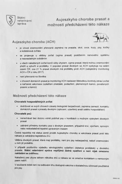 UPOZORNĚNÍ NA VÝSKYT AUJEZSKYHO CHOROBY !
